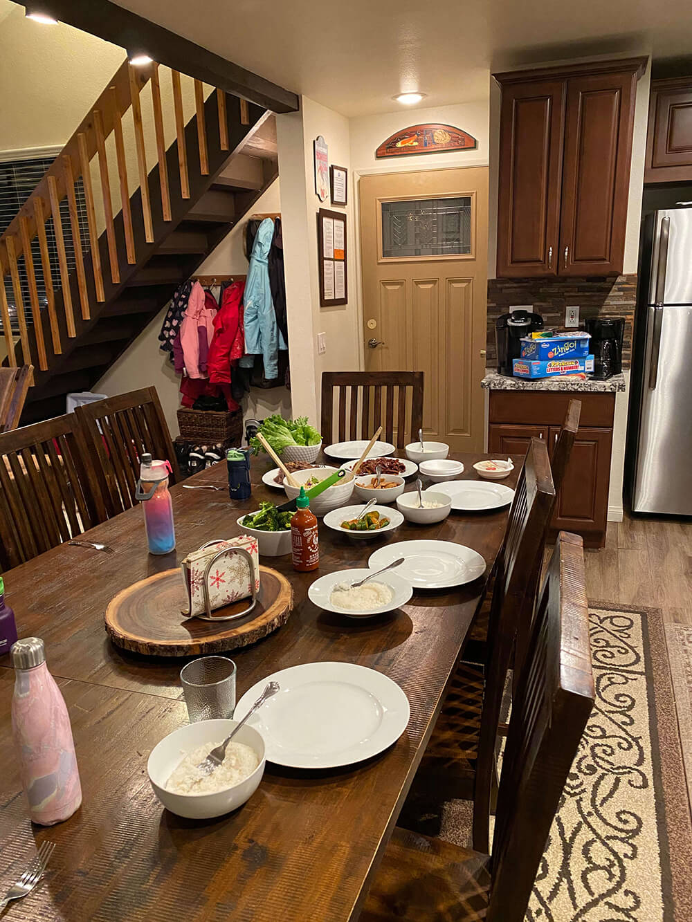 The first night, we ate dinner on the drive up, but since we had a kitchen, we made Korean short ribs the second night for everyone, our friends made baked ziti the third night and we ordered pizza the fourth. Restaurants were only open for take-out. It was much easier and cost effective to cook. For lunch, we packed lawn chairs and would bring sandwiches in a cooler in the morning, pick up the kids for lunch and tailgated outside our cars in the Canyon Lodge parking lot. Not fancy, but cheap, easy and no line for food. Now, it was also 50 degrees out during MLK weekend, so eating in lawn chairs outside our cars felt tropical…colder weather would have meant a quick drive (5 minutes) back to the condo and lunch there. Something to note when booking your accommodations! No indoor dining was permitted by state of CA at the time we went to Mammoth.