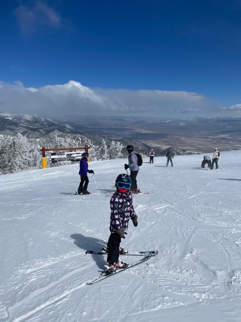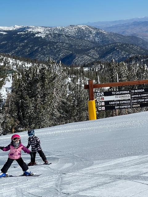 If you don’t plan to spend a good amount of your time cross country skiing on flat runs, head to the California side as soon as you get to the top of Tamarack. You’ll need to banzai the lower part of the California Trail and you still may have to pull your kids and yourselves a bit of the way to the Sky and Canyon Express lifts in California, but the California Trail cat track provides gorgeous views of the mountain. It is the most beautiful run we took on the mountain.