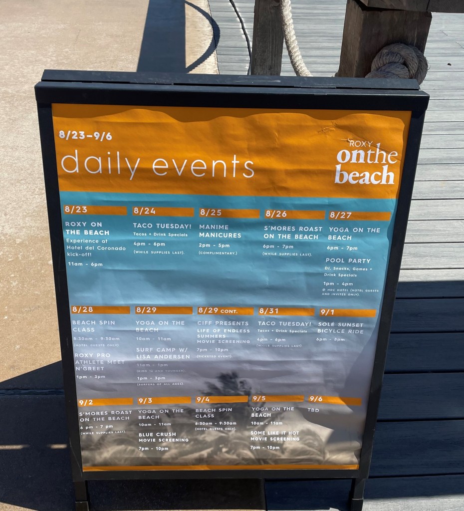 We spend a lot of time at the pool in a cabana this trip and infrequently ventured “off campus.” There are 7 restaurants at the hotel of varying prices and cuisine and includes a small marketplace. They are truly all worth trying, especially the sun deck with fire pits. While we relaxed on the deck, our kids did cartwheels and played tag with a bunch of other kids on the green belt next to us. It felt very safe and everyone was able to enjoy their own version of vacation! Just a quick warning…the very cute Beach & Taco Shack on the water only serves drinks starting at 7PM on Fri/Sat and 6PM on Sunday. We waited in a very long line thinking we’d grab dinner there one night with the kids and got to the front only to find the kitchen closed. There are a variety of activities available at the hotel as evidenced by the list below including beach spin classes…makes it easy to just stay on campus!