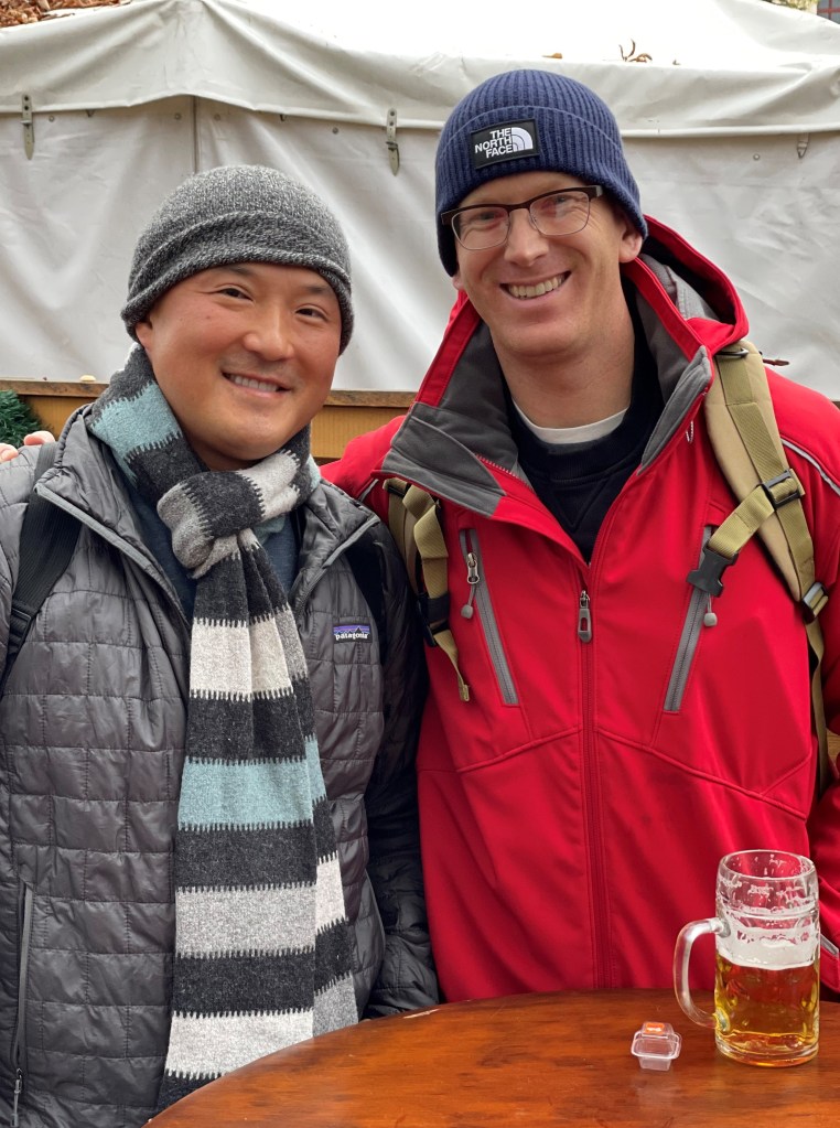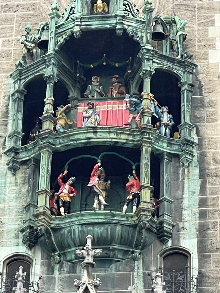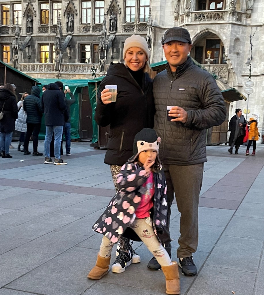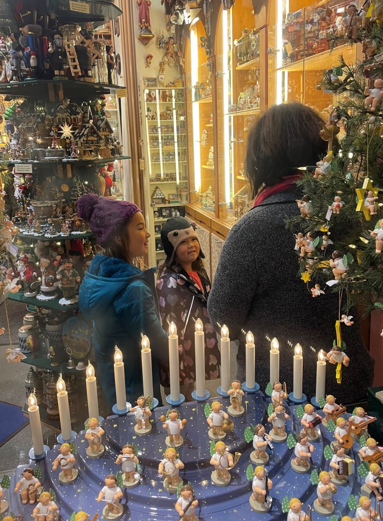 After checking in to the hotel, we walked directly to Marienplatz hoping to see the famous Christmas markets. We found instead wooden boxes with pictures promising pretzels and sweets and brats on the outside…but were told they would be carried away soon. No traditional Munich Christmas market during Covid. 2 years in a row. We grabbed to-go gluhwein (warm red or white wine) from a nearby restaurant, watched the girls discuss Christmas ornaments with a very kind German shop owner on their own and looked for a cab stand.