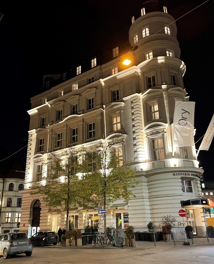 I had arranged a car and driver for us through our hotel, the Mandarin Oriental Munich. http://www.mandarinoriental.com. We could have taken the UBahn train from the airport, but I thought after a long flight, we might just want “easy.” I’m glad I did despite the expense: $185 Euro for one-way, 30 minute ride to our hotel.