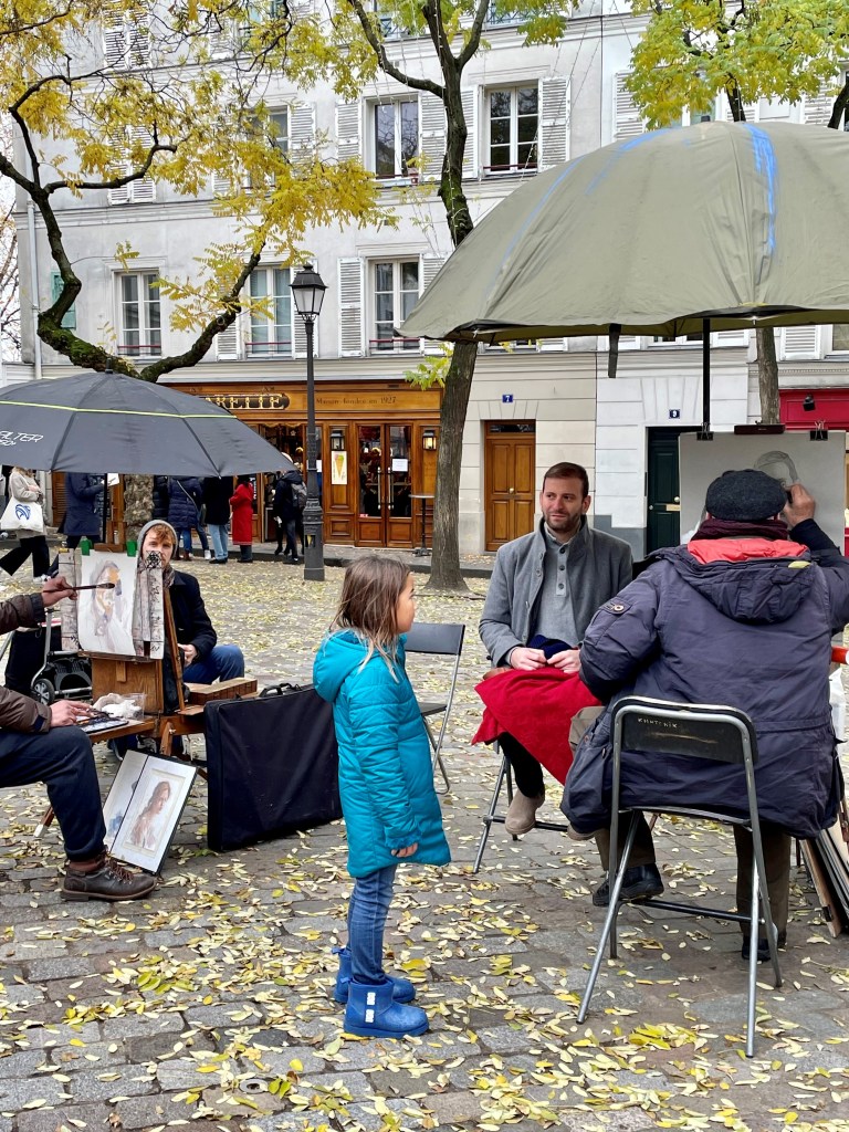 We then walked 5 minutes to Montmartre, which I knew the girls would love. Even though it was windy, cold and had started to rain a bit, the artists were still out, painting and drawing under umbrellas. We grabbed freshy made nutella crepes and headed to the Metro station below to get to the Louvre and Tuileries garden. Mapping our path on my phone using Google maps worked perfectly. It tells you when the next train arrives. Super slick!