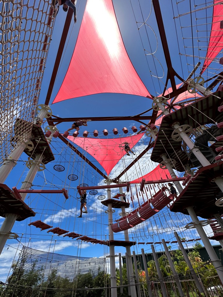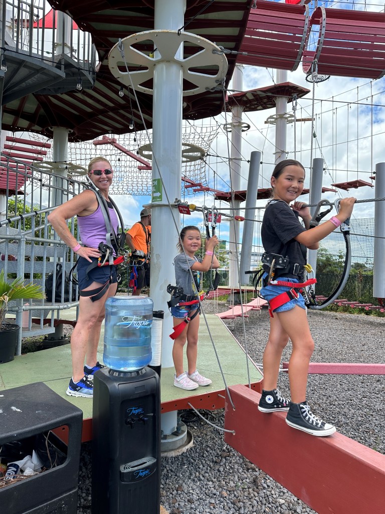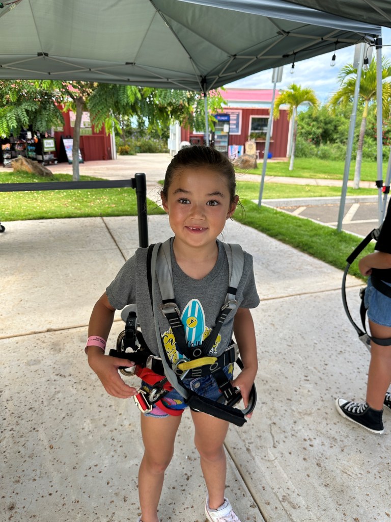 Another NEW activity we did on Maui this year based on the kids’ ages was the Adventure Park. We happily stumbled upon it and decided to try it out. You must be at least 7 years old to participate. There is an instructional video as well as hands on instruction on how to hook and unhook from the lifeline ropes throughout the course. And there are 6 “trails” with multiple levels of difficulty. The girls mainly stuck to the green and yellow courses, but I gradually ended up at the top of the vertical structure on the blue and black higher-level challenges. You learn quickly how to navigate the obstacles. Both girls ziplined on the course, though Emma, the diminutive 7 year old needed a little extra boost from me to hook to that rope. Parents do the course with their kids so they can help along the way. Book in the morning when they open to avoid the heat of summer if visiting during that time. We spent 2 ½ hours climbing and conquering the courses and it went by FAST. www.myadventurepark.com