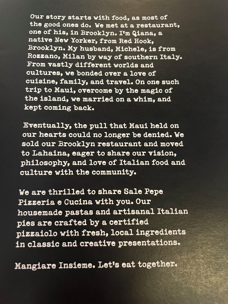 Sale Pepe Pizzeria & Cucina: not sure how I missed this restaurant in years past, but it’s in Lahaina, near Kimos…just not directly on Front Street. The chef/owner is from Italy and his wife is from Brooklyn and EVERYTHING we tried was phenomenal. Very family friendly. www.salepepemaui.com