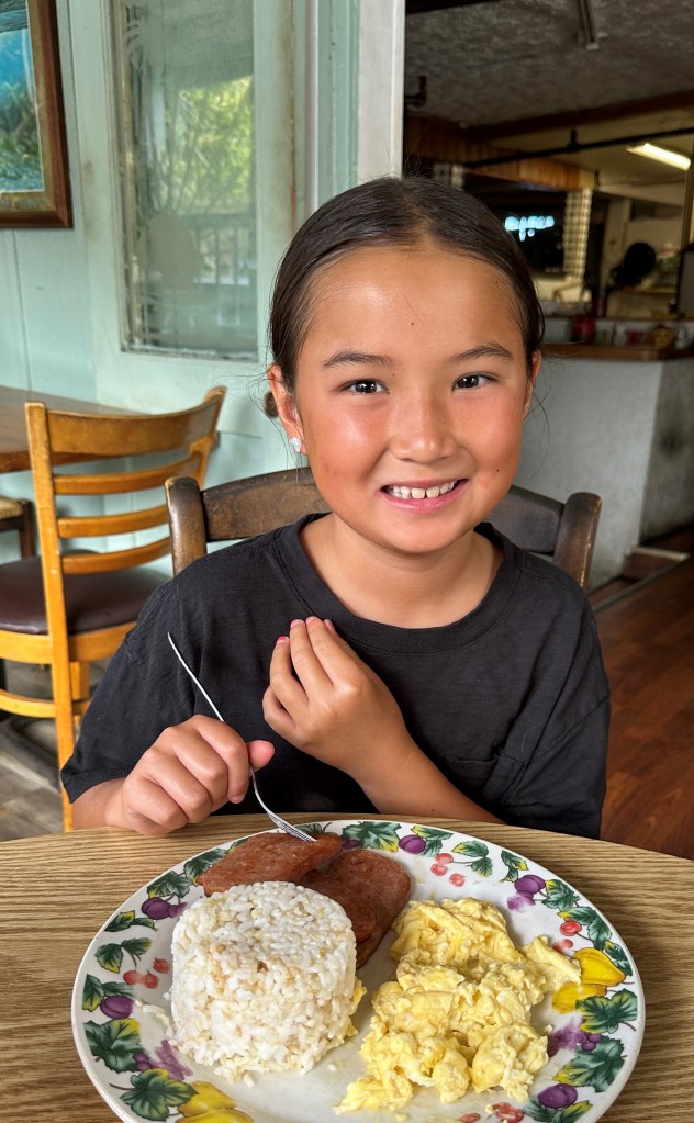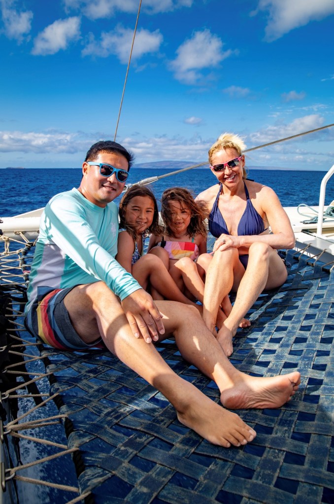 We met at the Harbor, a 40 minute drive from the hotel, at 7:30AM. Luckily, we still hadn’t adjusted to the Hawaii time zone, so the girls were up at 5AM anyway. There was ample parking at the Harbor. And, the cinnamon rolls for breakfast on the boat were delicious. We were one of an estimated 5 families with kids 13 and under and the boat staff was patient and accommodating to kids. The two bathrooms on the boat were clean, but with steep stairs to access each.