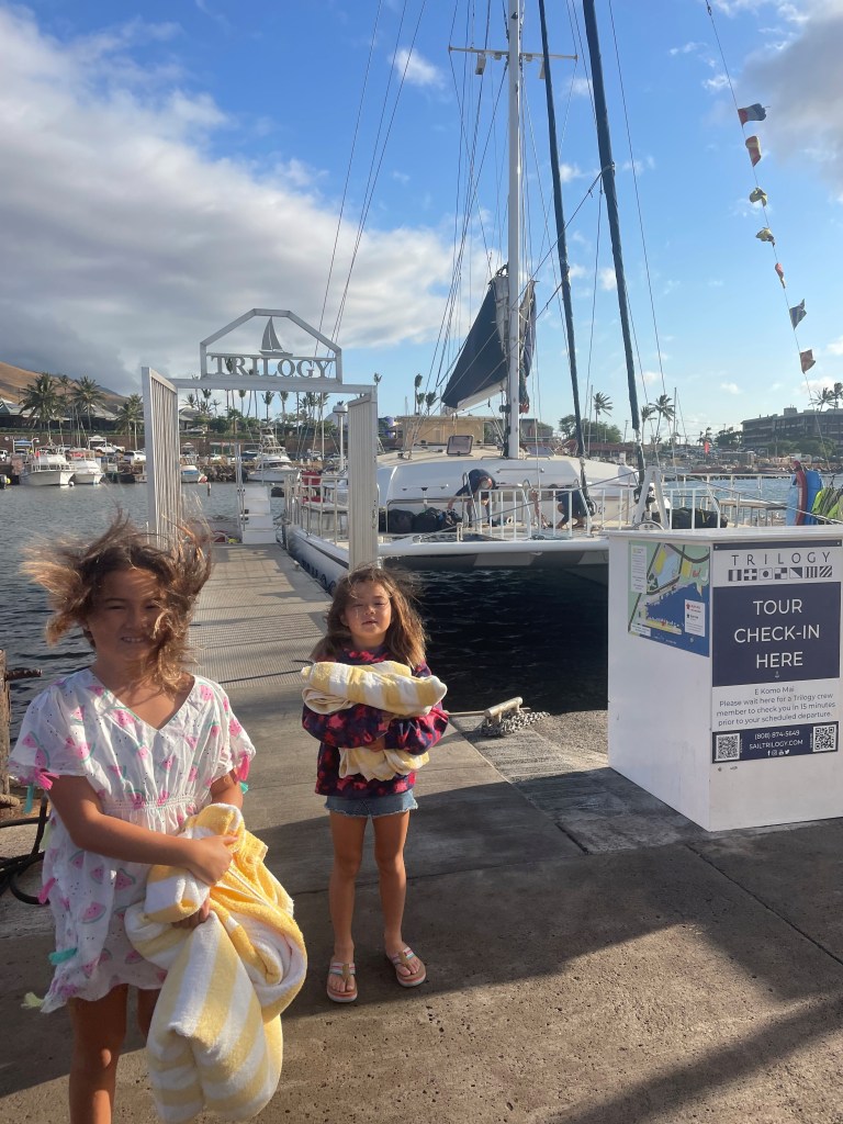 This year, since the girls are now 7 and 8 and able to operate a snorkel and mask, we booked a snorkel adventure to the Molokini Crater and Turtle Discover area for the second day we were in Maui. There were several options I researched, some leaving from Lahaina docks and many leaving from Ma’alaea Harbor closer to the airport. I chose the Sail Trilogy group out of Ma’alaea Harbor this year because of reviews I read about the food served on the boat!