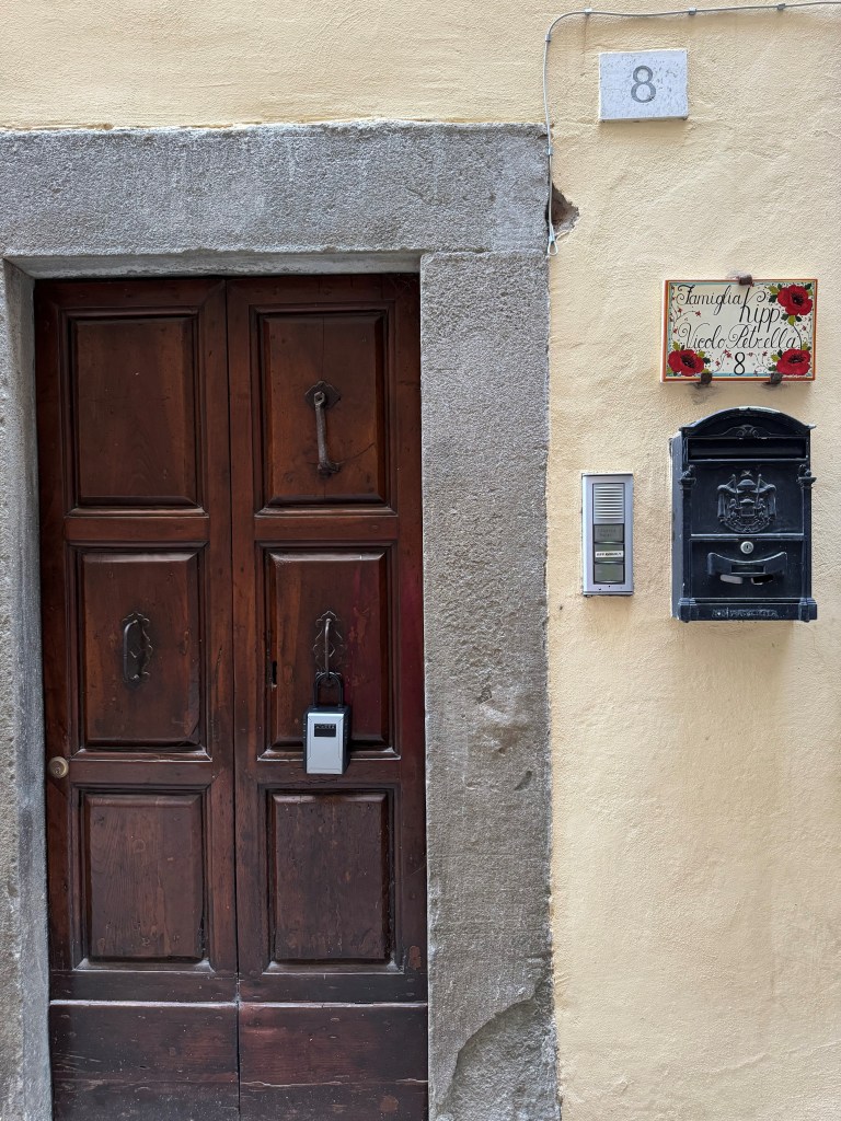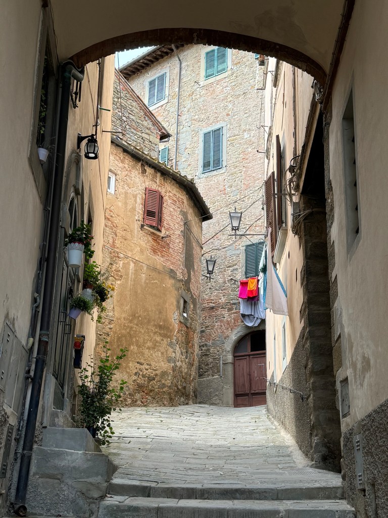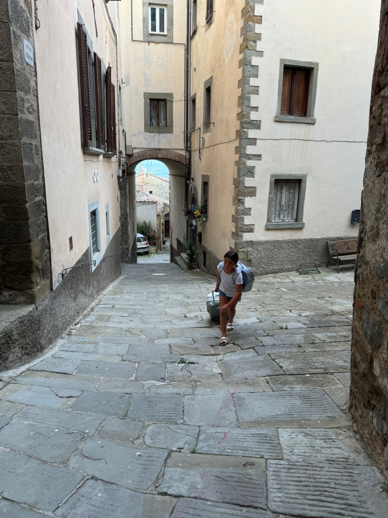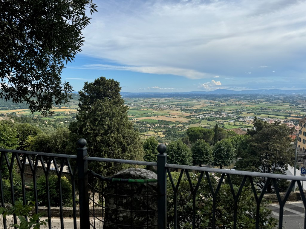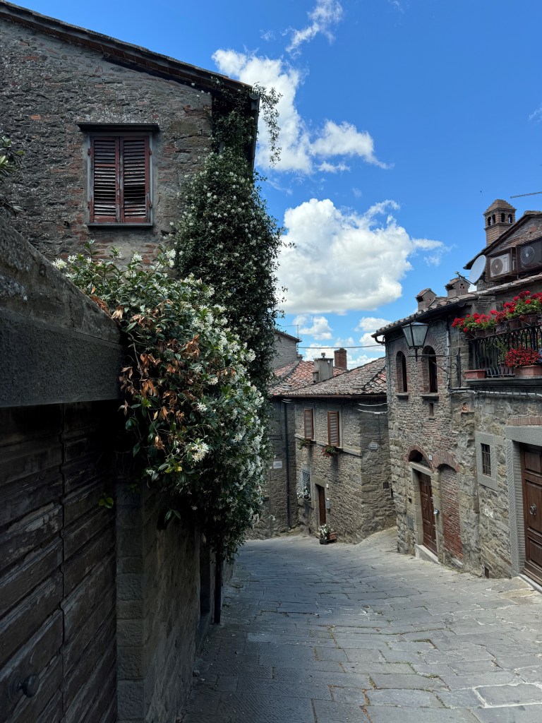 We arrived at about 6PM and took the free shuttle up, up, up, past small shops and big villas, about 15 minutes to the town of Cortona. Our apartment was easy to find, but we made an entrance, pulling our carry-on luggage across the cobblestones along the “main drag” (Via Nazionale) of Cortona, down a hill and around the corner to our front door. The town limits cars and the streets are extremely narrow; definitely a pedestrian-focused village. It is the definition of charming: outdoor seating along the streets and in the piazzas, Tuscan stone architecture, flowers draping doorways, small-town neighborhood feel and warm greetings from locals.