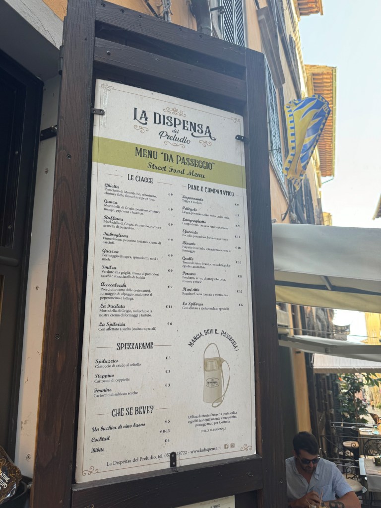 After lunch, we walked around a bit more, checked out the Dali exhibit, found the serene Parterre Park and watched some boys play aggressive street soccer. We then stopped at La Botteghina for a little apertivo. Apertivos became my favorite in Cortona and lots of restaurants and wine/cheese shops offer them. Little salami, little cheese, little wine at a cheap price. What’s not to love?!?!?! No website. Just Google. It’s at 27 Via Nazionale.