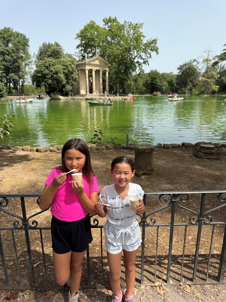 We began day 2 by exploring the Borghese Gardens, an 8 minute walk from the Hotel Savoy. Also near Borghese Gardens are the Westin and Marriott hotels. I picked a location near the Gardens because my daughters love to run and play and explore and, being the 3rd largest public park in Rome, the Gardens provide 197 acres to do all of the above. There are bike rentals of various types; playgrounds; merry go rounds and carnival rides; street performers; a zoo, sculptures; ponds; and museums. Though I’ve been twice before, we did not buy tickets to the Borghese Museum with the kids. I picked only a few museums on this trip to avoid burn out!