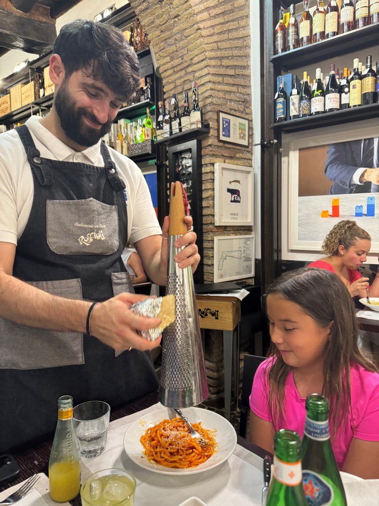 From there, we walked through the Campo de’ Fiori marketplace where the girls were very intrigued by the food, olive oil and purses on display. Lunch was around the corner from CdF at Roscoli and scheduled for 2:30PM. The reservation was made 3 months in advance. Definitely go here! People are packed in tightly which isn’t great for kids under 5, but ours were at a good age to appreciate the food and the ambiance. They have take-out and delivery as well!  www.salumeriaroscoli.com. FYI…there is also one in NYC.